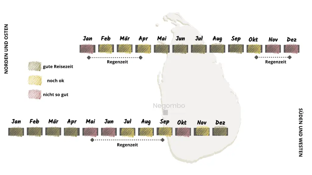 Wie in den meisten asiatischen Ländern gibt es auch in Sri Lanka keine Jahreszeiten wie wir sie kennen. Das Wetter wird durch den Monsun beeinflusst, wodurch du nach Regen- und Trockenzeit unterscheidest. Das Klima in Sri Lanka wird gleich durch zwei Monsune den Südwest- und den Nordost-Monsun geprägt.