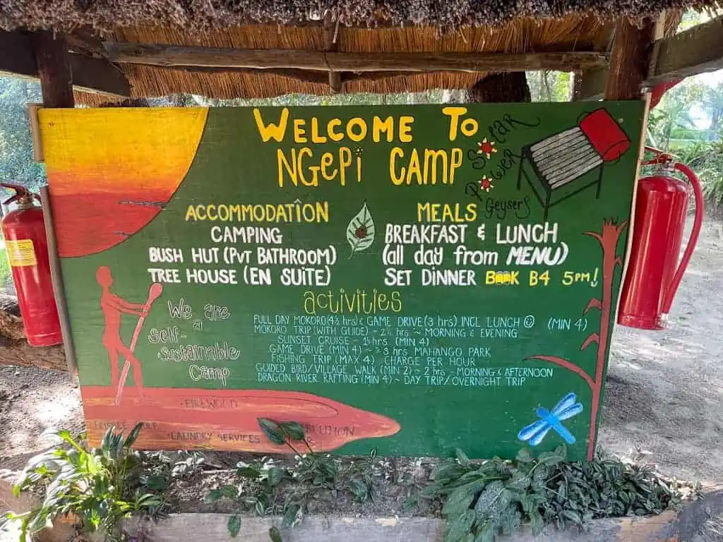 Das Ngepi Camp ist eine witzige „Hippe“ Campsite, welche schon auf dem Weg (bisschen sandig, aber kein 4×4 nötig) Sinn für Humor bewies. Die Campsites sind direkt am Fluss gelegen, in welchem du Krokodile und Nilpferde beobachten kannst. Die Campsites bieten Strom und sehr fantasievolle, gemeinschaftliche genutzte Sanitärbereiche. Auch der Flusspool ist ein Erlebnis. Neben einem Restaurant findest du an der Bar auch eine ungewöhnliche Cocktailkarte. Falls du nicht campen magst, bietet das Camp auch charmant gestaltete Baumhauszimmer und sogenannte Bush Huts.
